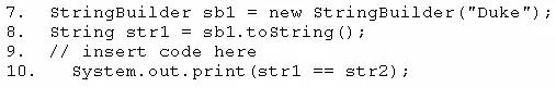 Which code fragment, when inserted at line 9, enables the code to print true?
