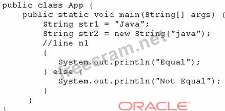Which code fragment, when inserted at line n1, enables the App class to print Equal?