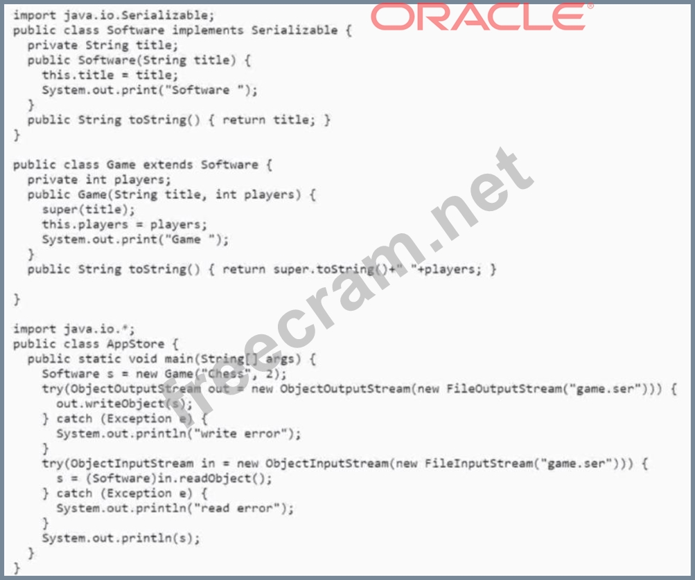 Explanation The answer is B because the code uses the writeObject and readObject methods of the ObjectOutputStream and ObjectInputStream classes to serialize and deserialize the Game object. These methods use the default serialization mechanism, which writes and reads the state of the object's fields, including the inherited ones. Therefore, the title field of the Software class is also serialized and deserialized along with the players field of the Game class. The toString method of the Game class calls the toString method of the Software class using super.toString(), which returns the value of the title field. Hence, when the deserialized object is printed, it shows "Software Game Software Game Chess 2". References: Oracle Certified Professional: Java SE 17 Developer Java SE 17 Developer OCP Oracle Certified Professional Java SE 17 Developer Study Guide Serialization and Deserialization in Java with Example