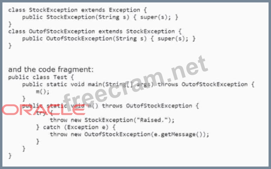 Explanation The answer is B because the code fragment contains a syntax error that prevents it from compiling. The code fragment tries to catch a StockException in line 10, but the catch block does not have a parameter of type StockException. The catch block should have a parameter of type StockException, such as: catch (StockException e) { // handle the exception } This is required by the Java syntax for the catch clause, which must have a parameter that is a subclass of Throwable. Without a parameter, the catch block is invalid and causes a compilation error. Option A is incorrect because the program does not throw a StockException, as it does not compile. Option C is incorrect because the program does not throw an OutofStockException, as it does not compile. Option D is incorrect because the program does not throw a ClassCastException, as it does not compile. References: Oracle Certified Professional: Java SE 17 Developer Java SE 17 Developer OCP Oracle Certified Professional Java SE 17 Developer Study Guide The try-with-resources Statement (The Java™ Tutorials > Essential Classes > Exceptions) The catch Blocks (The Java™ Tutorials > Essential Classes > Exceptions)