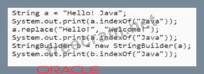 Explanation The code fragment is creating a string variable "a" with the value "Hello! Java". Then, it is printing the index of "Java" in "a". Next, it is replacing "Hello!" with "Welcome!" in "a". Then, it is printing the index of "Java" in "a". Finally, it is creating a new StringBuilder object "b" with the value of "a" and printing the index of "Java" in "b". The output will be 8109 because the index of "Java" in "a" is 8, the index of "Java" in "a" after replacing "Hello!" with "Welcome!" is 10, and the index of "Java" in "b" is 9. References: Oracle Java SE 17 Developer source and documents: [String (Java SE 17 & JDK 17)], [StringBuilder (Java SE 17 & JDK 17)]