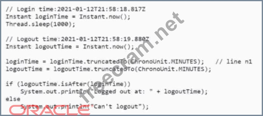 Explanation The code fragment is using the Java SE 17 API to get the current time and then truncating it to minutes. The result will be the current time truncated to minutes, which is why option B is correct. References: https://education.oracle.com/products/trackp_OCPJSE17 https://mylearn.oracle.com/ou/learning-path/java-se-17-developer/99487 https://docs.oracle.com/javase/17/docs/api/java.base/java/time/Instant.html#truncatedTo(java.time.tempora