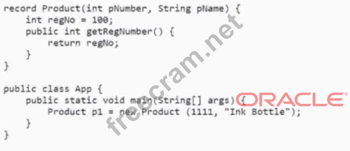 Explanation The code will compile if the regNo variable is made public. This is because the regNo variable is being accessed in the main method of the App class, which is outside the scope of the Product class. Making the regNo variable public will allow it to be accessed from outside the class. References: https://education.oracle.com/products/trackp_OCPJSE17, https://mylearn.oracle.com/ou/learning-path/java-se-17-developer/99487, https://docs.oracle.com/javase/tutorial/java/javaOO/accesscontrol.html
