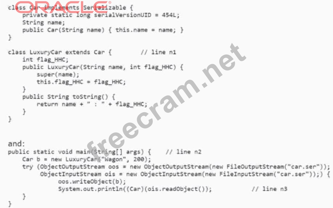 Explanation The code fragment is trying to read an object from a file using the ObjectInputStream class. This class throws an IOException and a ClassNotFoundException. To handle these exceptions, the main method signature should declare that it throws these exceptions. Otherwise, the code will not compile. If the main method throws these exceptions, the code will print Wagon : 200, which is the result of calling the toString method of the LuxuryCar object that was written to the file. References: ObjectInputStream (Java SE 17 & JDK 17) - Oracle, ObjectOutputStream (Java SE 17 & JDK 17) - Oracle