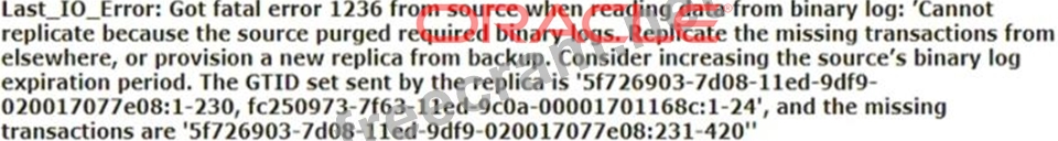 The error message indicates that the source has purged required binary logs, making it impossible to replicate the missing transactions. This happens when the administrator manually deletes binary log files from the source DB system, or the binary log expiration period is too short, causing automatic purging before the replica can fetch the transactions.