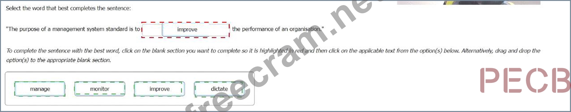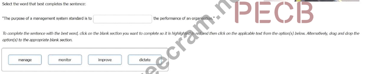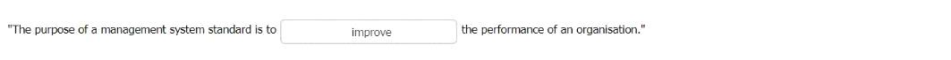 Explanation: According to the ISO - Management system standards page, the key benefits of an effective management system include improved operational effectiveness and efficiency, improved risk management and protection of people and the environment, and enhanced drive for innovation. The Integrated Use of Management System Standards (IUMSS) handbook also states that the purpose and objectives of management system standards are to help organizations improve their performance by specifying repeatable steps that organizations consciously implement to achieve their goals and objectives. Therefore, the complete sentence is: "The purpose of a management system standard is to improve the performance of an organisation."