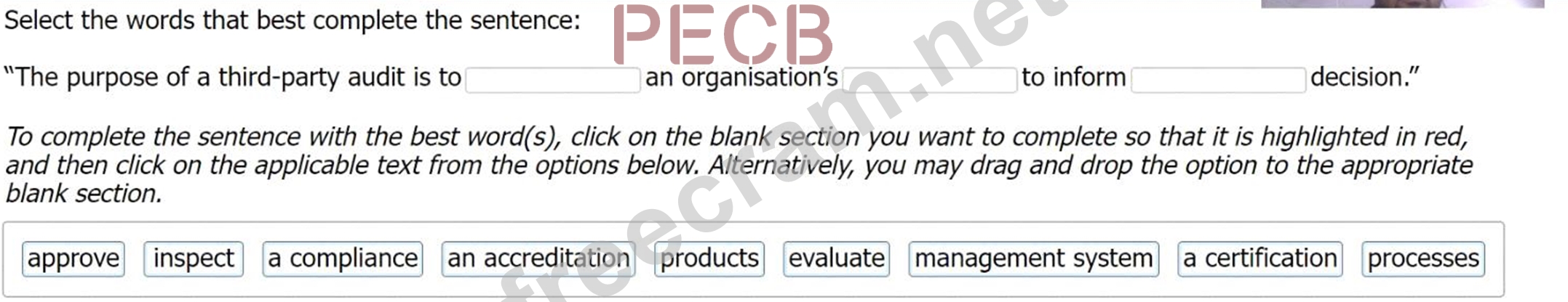 A third-party audit is an independent assessment of an organisation's management system by an external auditor, who is not affiliated with the organisation or its customers. The auditor verifies that the management system meets the requirements of a specific standard, such as ISO 27001, and evaluates its effectiveness and performance. The auditor also identifies any strengths, weaknesses, opportunities, or risks of the management system, and provides recommendations for improvement. The purpose of a third-party audit is to provide an objective and impartial evaluation of the organisation's management system, and to inform a certification decision by a certification body. A certification body is an organisation that grants a certificate of conformity to the organisation, after reviewing the audit report and evidence, and confirming that the management system meets the certification criteria. A certification decision is the outcome of the certification process, which can be positive (granting, maintaining, renewing, or expanding the scope of certification) or negative (suspending, withdrawing, or reducing the scope of certification). References: