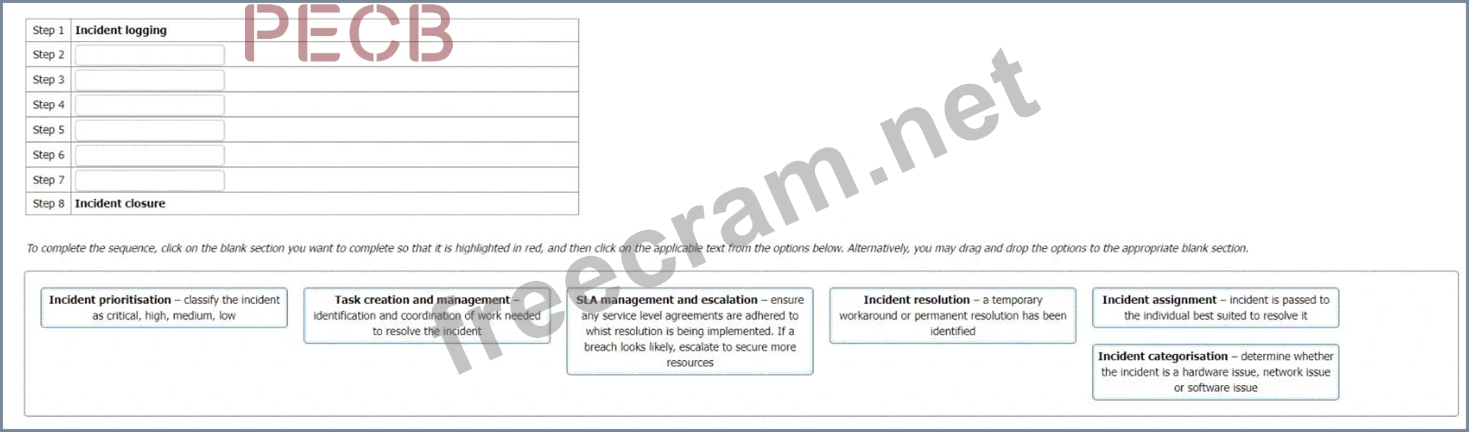 * Step 8 = Incident closure: This step involves closing the incident, event, or weakness, after verifying that it has been resolved satisfactorily, and that all the actions have been completed and documented.