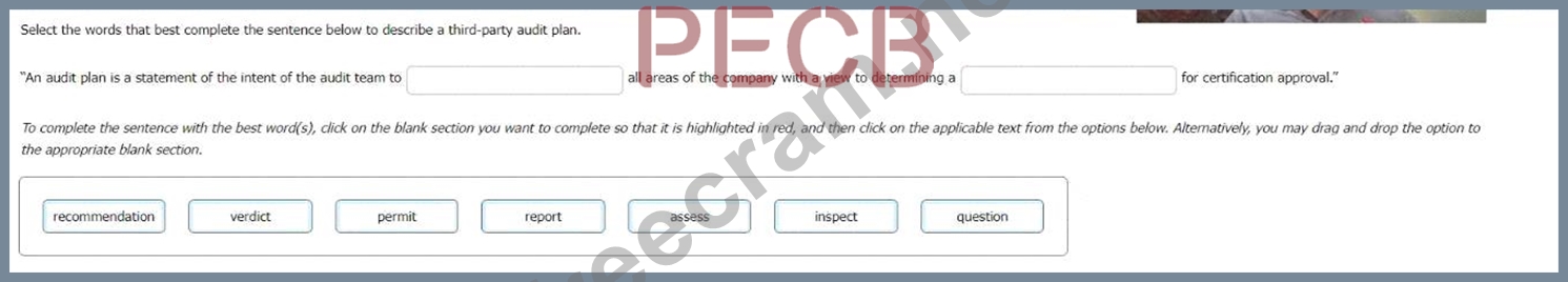 Therefore, the purpose of the audit plan is to state the intention of the audit team to assess all areas of the company, meaning to evaluate the performance and effectiveness of the ISMS, and to determine a recommendation for certification approval, meaning to provide a judgment on the certification status of the ISMS. The other words in the options, such as verdict, permit, report, inspect, and question, do not accurately reflect the meaning of the audit plan. A verdict is a formal decision made by a judge or a jury, not by an audit team. A permit is a legal authorization to do something, not a certification of conformity. A report is a document that presents the audit results, not the audit intention. An inspection is a visual examination of something, not a comprehensive assessment of an ISMS. A question is a request for information, not a determination of a recommendation.