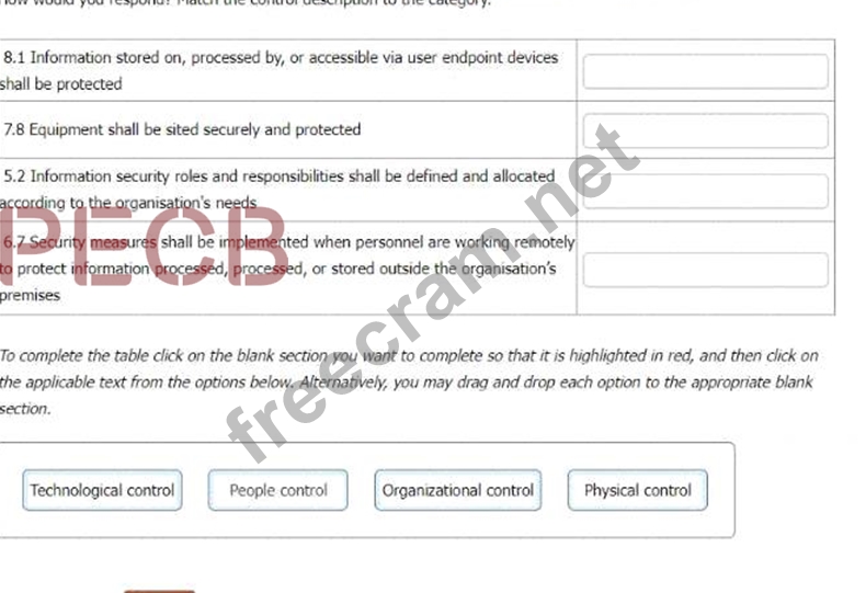 = Technological control 7.8 Equipment shall be sited securely and protected = Physical control 5.2 Information security roles and responsibilities shall be defined and allocated according to the organisation's needs = Organisational control 6.7 Security measures shall be implemented when personnel are working remotely to protect information processed, processed, or stored outside the organisation's premises = People control Explanation: According to the web search results from my predefined tool, ISO 27001:2022 has restructured and consolidated the Annex A controls into four categories: organisational, people, physical, and technological12. These categories reflect the different aspects and dimensions of information security, and are aligned with the cybersecurity concepts of identify, protect, detect, respond, and recover3. The controls in each category are as follows4: