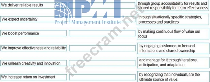 The PM Declaration of Interdependence is a set of six management principle initially intended for project managers of Agile software development projects. Match the items below to identify the principles.