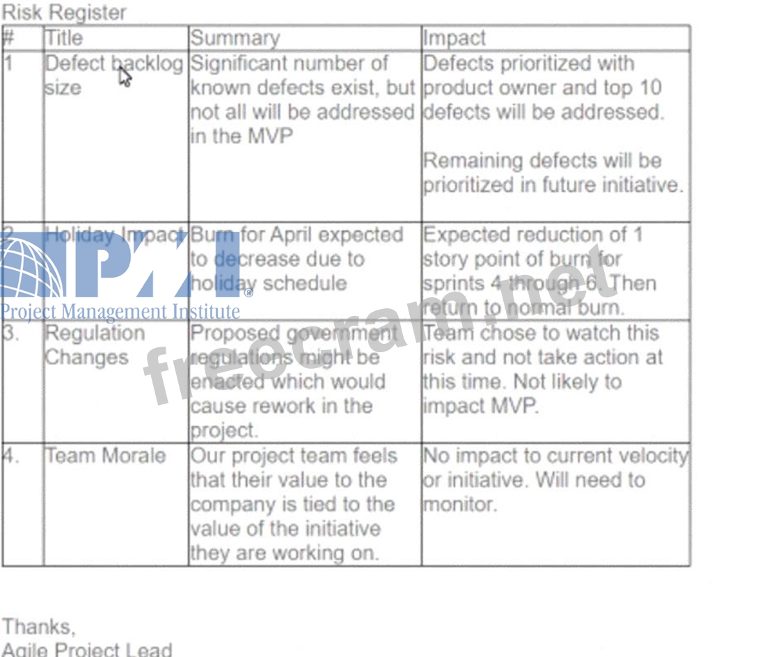 A project team's manager is responsible for delivering a specific initiative for the organization. They are preparing for a monthly meeting where the manager will present on the current state of this initiative. The agile project lead sends the manager the following email with the current initiative status (Refer to the email exhibit).
