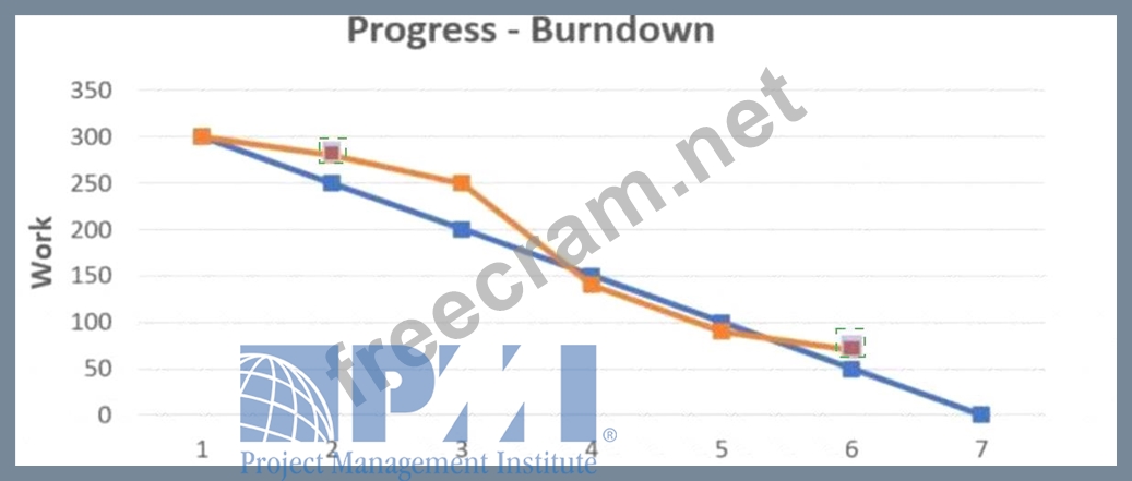 A project is on its sixth iteration out of seven. Select the two points where the team is performing better than expected. (Choose two.)