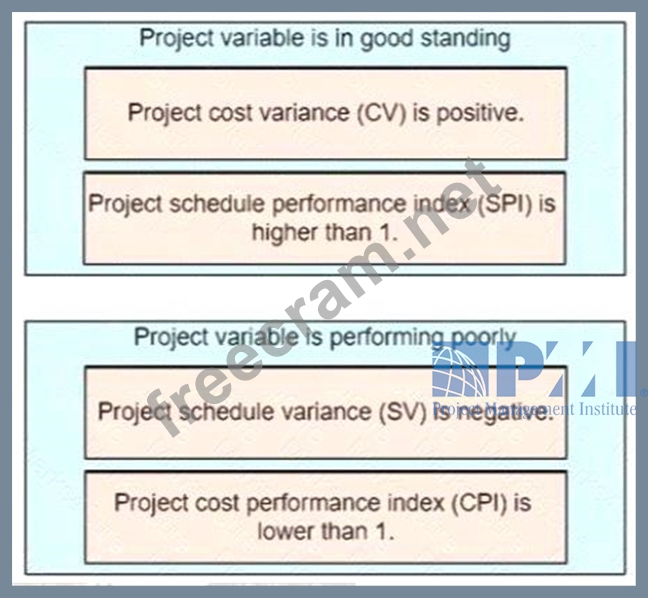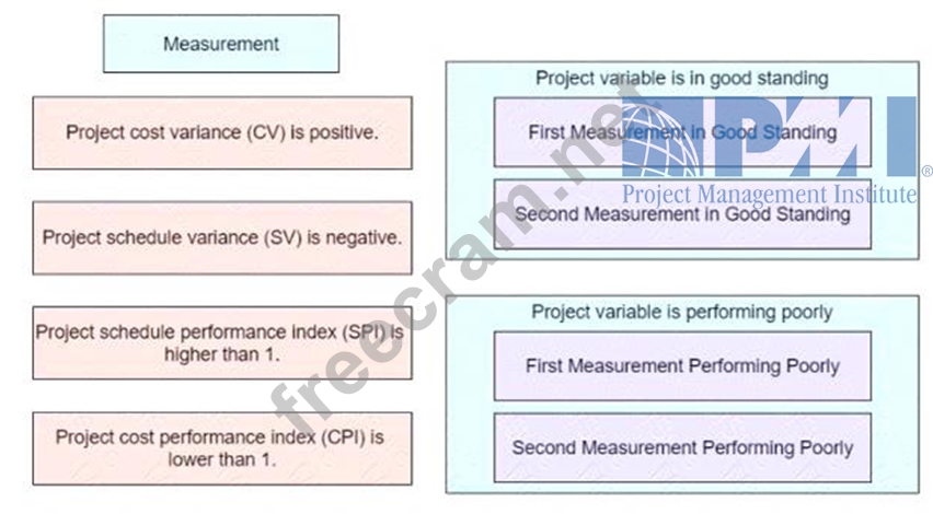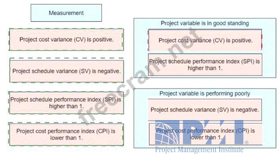 A project manager is leading a project in which key performance Indicators (KPls) are measured through earned value management (EVM). Match each measurement on the left with the correct category on the right.