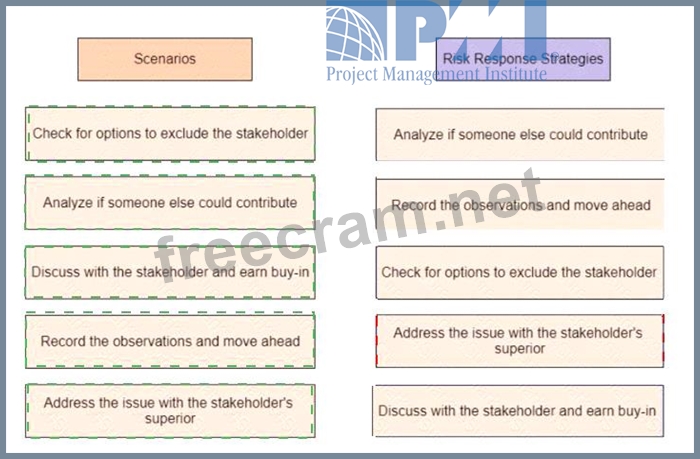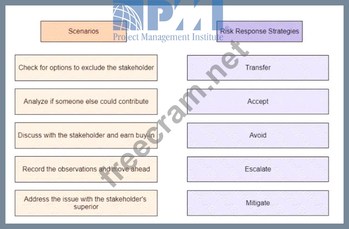 A project manager is worried that a key stakeholder is not participating in the project and has concluded that the final product is not as good as it could have been if the stakeholder had been more involved Drag the scenario on the left to the correct risk response strategy on the right