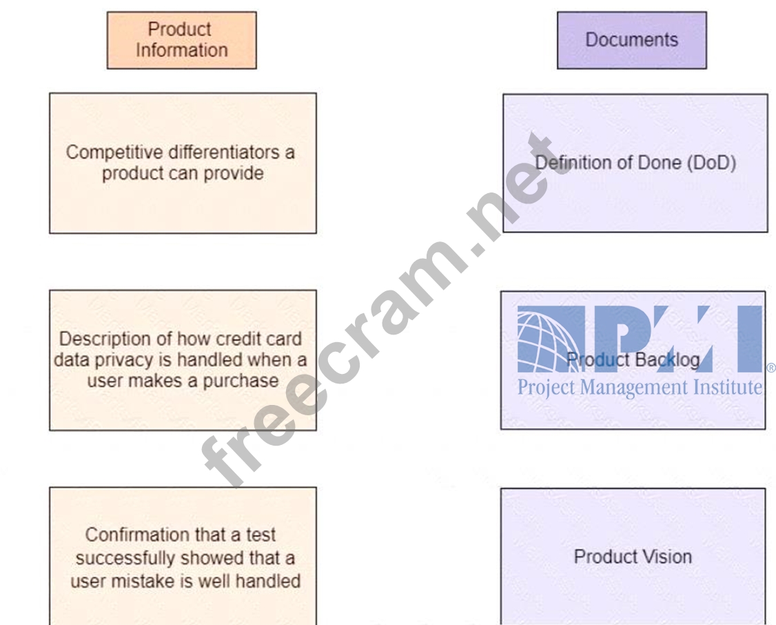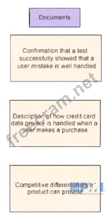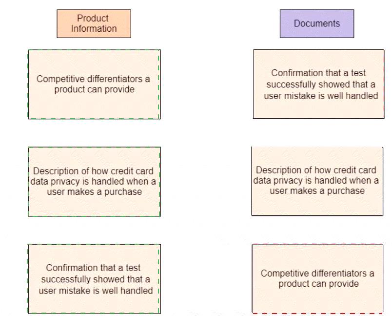 According to a new product development process, the marketing department will begin adding business and user requirements directly into agile project documents. Drag the product information on the left to the correct documents on the right
