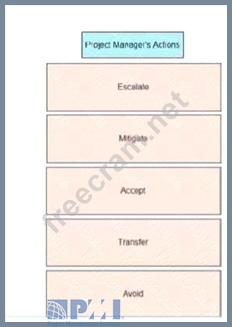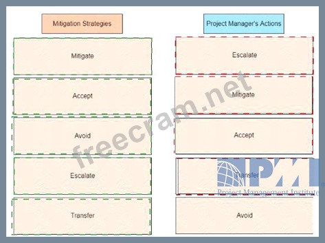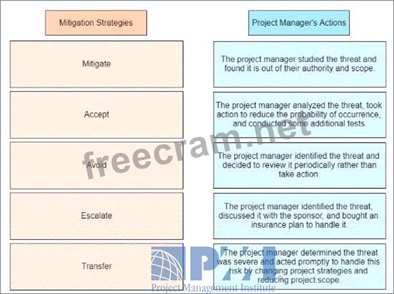 An experienced project manager is overseeing a merger and acquisition project. The project manager reacted differently to different threats identified on the project Drag the mitigation strategy on the left to the project manager's actions on the right
