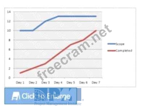 The burnup chart indicates that the "Completed" work is trailing behind the "Scope," suggesting that the team is not meeting the expectations set by the product owner. This discrepancy can be due to various factors such as underestimation of tasks, unforeseen challenges, or scope changes. It's important for the project lead to address this with the product owner and team to realign expectations, reassess the workload, and implement corrective actions to ensure that project goals are met within the sprint timeframe. References: * A Guide to the Project Management Body of Knowledge (PMBOKGuide) * The PMI Guide to Business Analysis * Business Analysis for Practitioners: A Practice Guide12345.