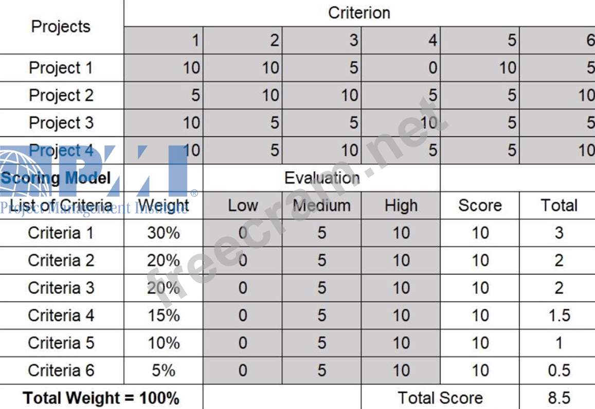 You're ranking projects using a scoring model consisting of a series of evaluation criteria. The above figure shows the score measure and the weight for each criterion. Which project has the highest priority?