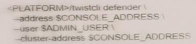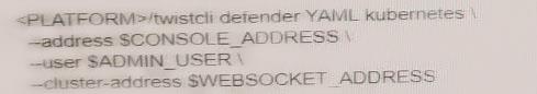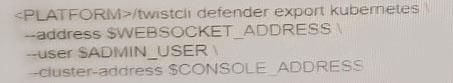 An administrator wants to install the Defenders to a Kubernetes cluster. This cluster is running the console on the default service endpoint and will be exporting to YAML Console Address SCONSOLE_ADDRESS Websocket Address SWEBSOCKHT_ADDRESS User: SADMIN USER Which command generates the YAML file for Defender install? A) B) C) D)