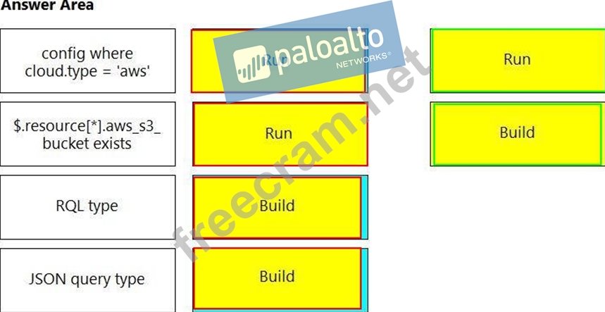 You wish to create a custom policy with build and run subtypes. Match the query types for each example.