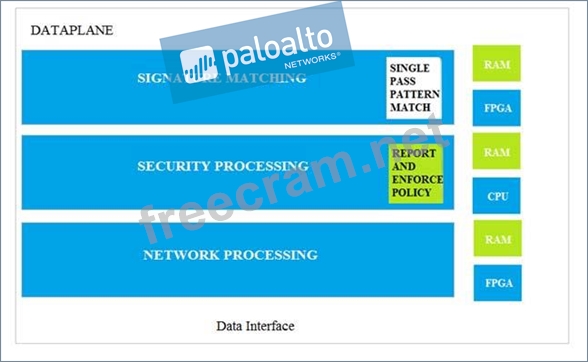 Which data-plane processor layer of the graphic shown provides uniform matching for spyware and vulnerability exploits on a Palo Alto Networks Firewall?