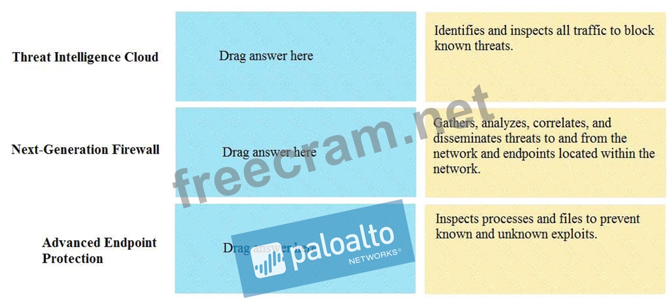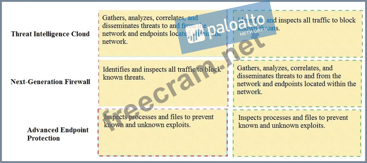 Explanation Threat Intelligence Cloud - Gathers, analyzes, correlates, and disseminates threats to and from the network and endpoints located within the network. Next-Generation Firewall - Identifies and inspects all traffic to block known threats Advanced Endpoint Protection - Inspects processes and files to prevent known and unknown exploits