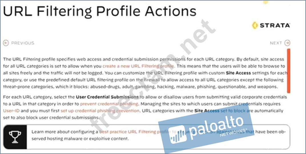 Question 8: Which URL Filtering Profile action does not generate a log e...
