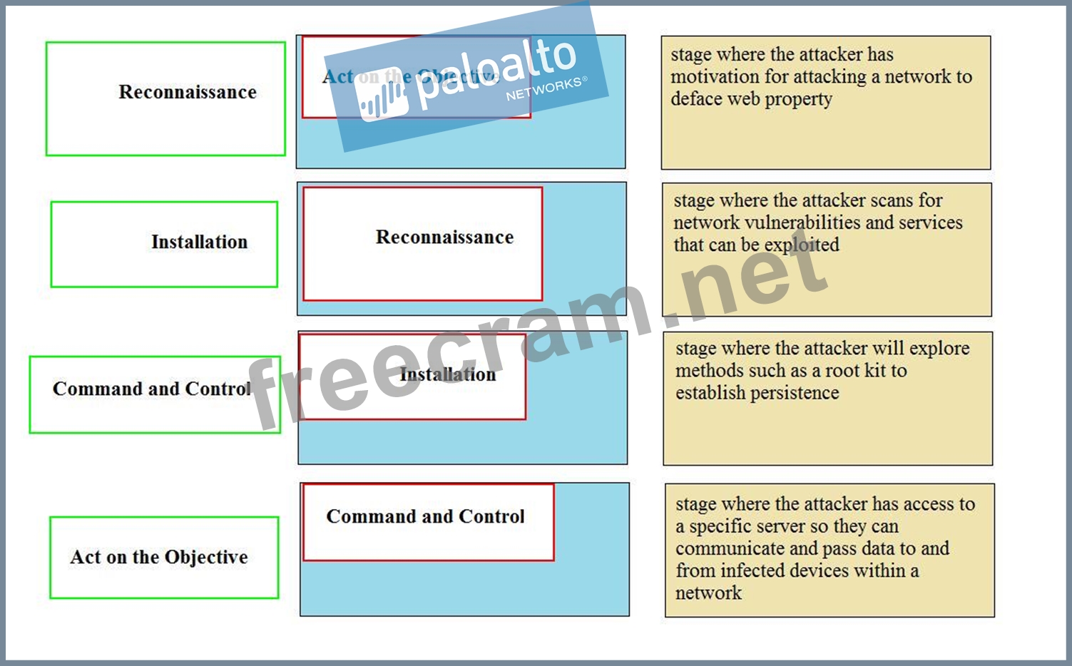 Question 50: Match the Cyber-Attack Lifecycle stage to its correct descri...