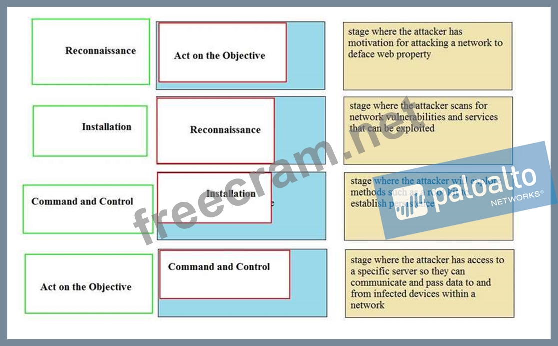 Question 225: Match the cyber-attack lifecycle stage to its correct descri...