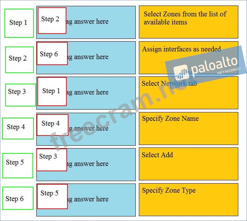Order the steps needed to create a new security zone with a Palo Alto Networks firewall.