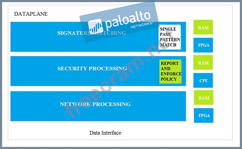 Which data-plane processor layer of the graphic shown provides uniform matching for spyware and vulnerability exploits on a Palo Alto Networks Firewall?
