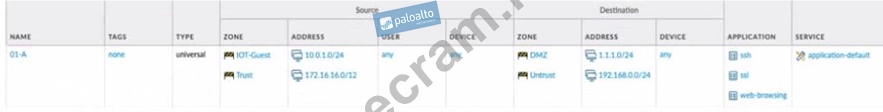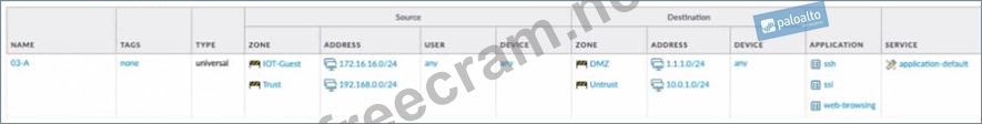 View the diagram. What is the most restrictive, yet fully functional rule, to allow general Internet and SSH traffic into both the DMZ and Untrust/lnternet zones from each of the lOT/Guest and Trust Zones?