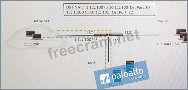 The security policy should be from "source zone: untrusted" "source host: any" and "destination zone: DMZ", so answers (C and E) eliminated so far, so it's either A, B or D, right? nope, because of of the "destination host: 1.1.1.100" with web-browsing and ssh, can be done is 1 or 2 rules