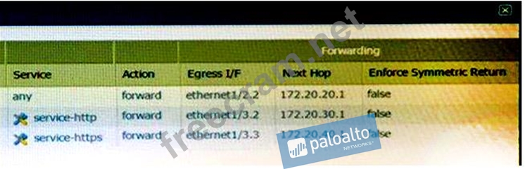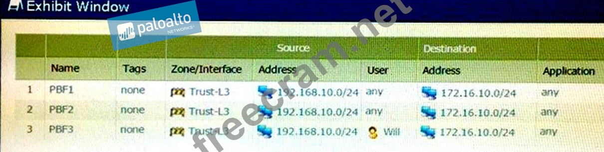 A firewall has three PBF rules and a default route with a next hop of 172.20.10.1 that is configured in the default VR. A user named Will has a PC with a 192.168.10.10 IP address. He makes an HTTPS connection to 172.16.10.20.