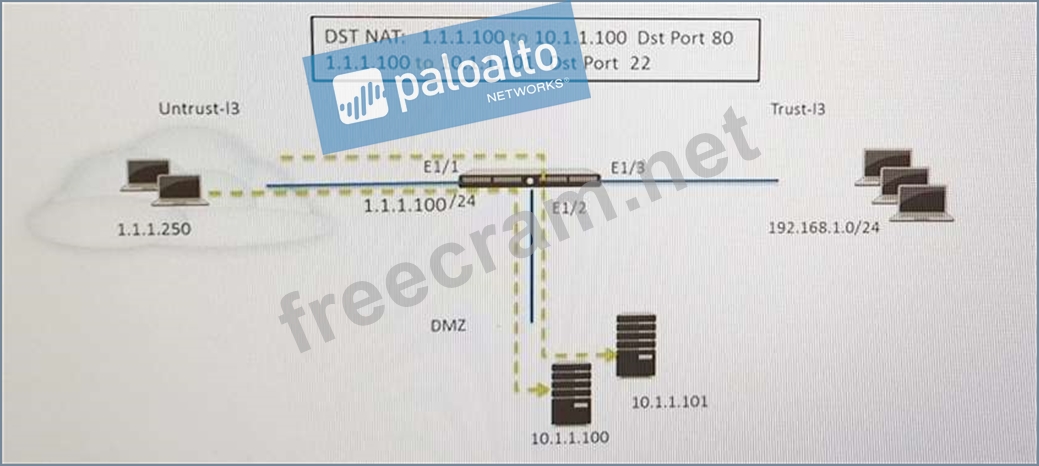 Refer to the exhibit. An administrator is using DNAT to map two servers to a single public IP address. Traffic will be steered to the specific server based on the application, where Host A (10.1.1.100) receives HTTP traffic and HOST B (10.1.1.101) receives SSH traffic.)
