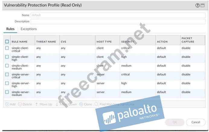 Explanation The Exceptions settings allows you to change the response to a specific signature. For example, you can block all packets that match a signature, except for the selected one, which generates an alert. The Exception tab supports filtering functions. If you not believed, then login the firewall go to Vulnerability > Exceptions and select "Show all signatures". From there you will see all threat information including specific actions. More detail: https://knowledgebase.paloaltonetworks.com/KCSArticleDetail?id=kA10g000000Cm4yCAC