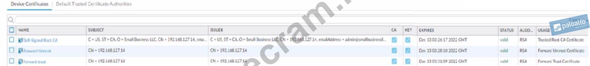 Review the screenshot of the Certificates page. An administrator for a small LLC has created a series of certificates as shown, to use for a planned Decryption roll out. The administrator has also installed the self-signed root certificate in all client systems. When testing, they noticed that every time a user visited an SSL site, they received unsecured website warnings. What is the cause of the unsecured website warnings?
