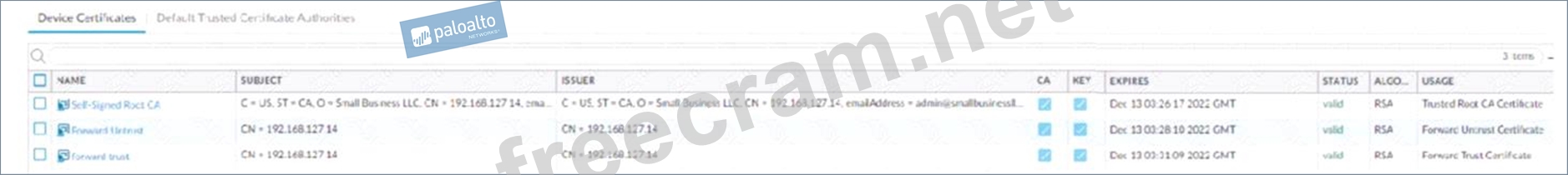 The cause of the unsecured website warnings is that the forward trust certificate has not been signed by the self-signed root CA certificate. The forward trust certificate is used by the firewall to generate a copy of the server certificate for outbound SSL decryption (SSL Forward Proxy). The firewall signs the copy with the forward trust certificate and presents it to the client. The client then verifies the signature using the public key of the CA that issued the forward trust certificate. If the client does not trust the CA, it will display a warning message. Therefore, the forward trust certificate must be signed by a CA that is trusted by the client. In this case, the administrator has installed the self-signed root CA certificate in all client systems, so this CA should be used to sign the forward trust certificate. However, as shown in the screenshot, the forward trust certificate has a different issuer than the self-signed root CA certificate, which means it has not been signed by it. This causes the client to reject the signature and show a warning message. To fix this issue, the administrator should generate a new forward trust certificate and sign it with the self-signed root CA certificate12. References: Keys and Certificates for Decryption Policies, How to Configure SSL Decryption