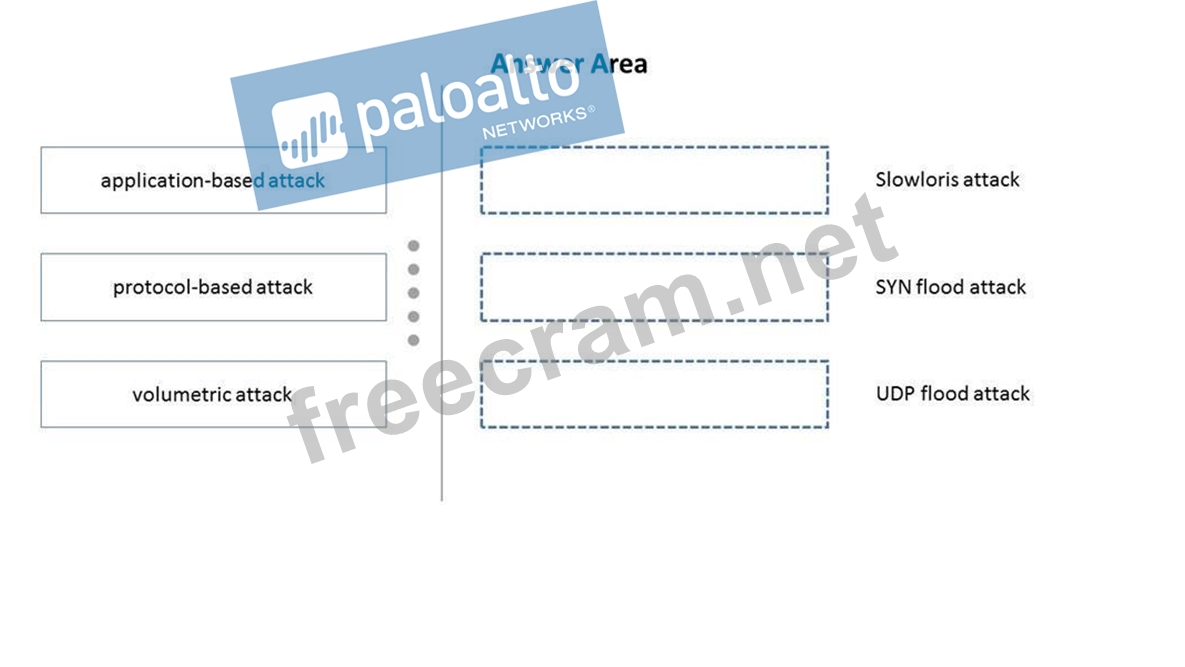 Based on PANW Best Practices for Planning DoS and Zone Protection, match each type of DoS attack to an example of that type of attack.