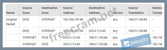 The table displays NAT rules configured on the firewall. The key points are: Source Zone and Destination Zone define the traffic flow. Source Address and Destination Address specify the IP addresses involved. Service indicates the type of traffic (e.g., any, ping). Source Translation and Destination Translation show the translated IP addresses for NAT. Issue and Resolution Options The application server at 192.168.197.40 can establish outbound connections but faces issues with inbound connections due to the shared NAT IP 198.51.100.88. The external database server cannot establish a secure connection back to 192.168.197.40. Options to Resolve the Issue: Replace the Two NAT Rules with a Single Rule: Combining both DMZ servers into one NAT rule might simplify configuration but could cause issues in distinguishing inbound traffic for each server. Pros: Simplifies rule management. Cons: Might not address the inbound traffic issue properly. New Public IP Address: Obtaining a new public IP address for the new server (192.168.197.40) ensures dedicated inbound and outbound NAT. Pros: Clear separation of traffic, resolves inbound connectivity issues. Cons: Requires additional public IP. Separate Source NAT and Destination NAT Rules: Configuring distinct NAT rules for source and destination addresses without using the bidirectional option. Pros: Clear and distinct rules for each direction of traffic. Cons: More complex to manage, might require more firewall resources. Move the NAT Rule: Adjusting the order of NAT rules to prioritize the new server's rule. Pros: Simple reordering might resolve prioritization conflicts. Cons: Might not fully resolve the inbound connection issue.