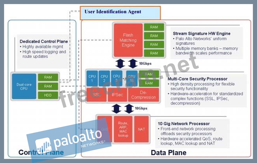 * Logging, with all logs sent to the control plane for processing and storage DE: The following diagram depicts both the hardware and software architecture of the next-generation firewall