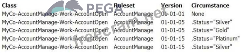 An application includes the following set of circumstanced instances of a decision table. You update the application and increment the AccountManage ruleset version to 01-02-01. As part of this update, the circumstance .Status= "Silver" is no longer needed by the application. How do you implement this change?