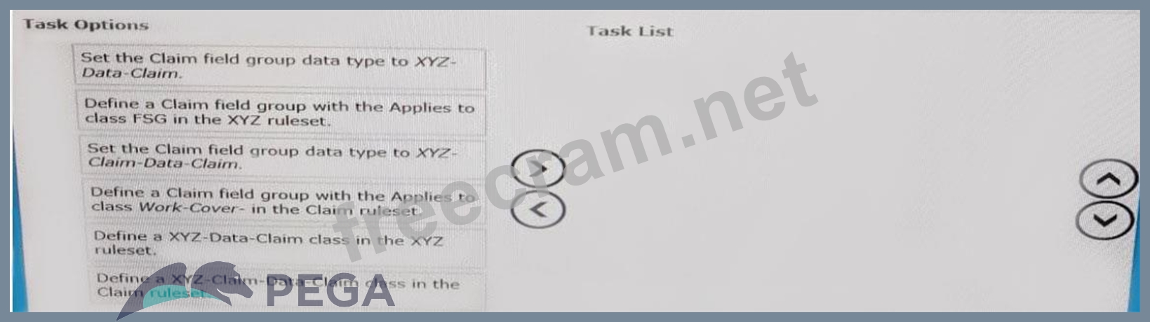 XYZ Inc.'s COE wants case life cycle developers to use a field group named "Claim" regardless of the application being developed. Select and move the three tasks that the COE performs for this requirement to the Task List column and place them in the correct order. (Choose Three)