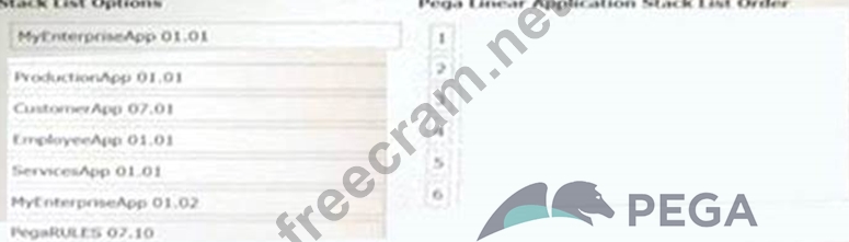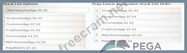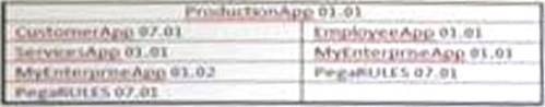 DRAG DROP The following figure depicts a hierarchy of applications that are built on other applications. Specifically, the productionapp application is built on applications customerapp and employeeapp. Each of these applications has additional built-on applications, including the duplicated MYEnterpriseApp application, which has two different versions in use. All applications are built on the same version of PegaRUUS.