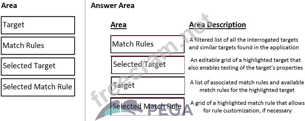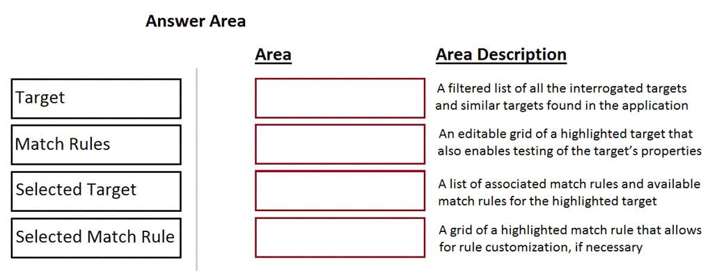 The Adapter Match Rules tab provides the developer the access to resolve match rule issues during interrogation of an application and during maintenance of the solution. The Match Rules tab contains four areas. Drag each Area on the left to the correct Area Description.