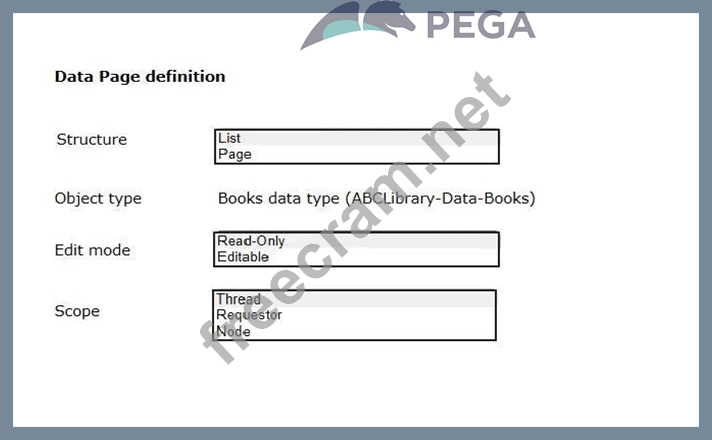 A library application used by staff creates a loan request case when a member wishes to borrow one or more books. As part of the case process, the application shows the staff a read-only list of outstanding past-due books to remind the member to return late books. In the Answer Area, select the Data page definition for this use case.