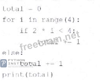 The code snippet that you have sent is calculating the value of a variable "total" based on the values in the range of 0 to 3. The code is as follows: total = 0 for i in range(0, 3): if i % 2 == 0: total = total + 1 else: total = total + 2 print(total) The code starts with assigning the value 0 to the variable "total". Then, it enters a for loop that iterates over the values 0, 1, and 2 (the range function excludes the upper bound). Inside the loop, the code checks if the current value of "i" is even or odd using the modulo operator (%). If "i" is even, the code adds 1 to the value of "total". If "i" is odd, the code adds 2 to the value of "total". The loop ends when "i" reaches 3, and the code prints the final value of "total" to the screen. The code outputs 2 to the screen, because the value of "total" changes as follows: * When i = 0, total = 0 + 1 = 1 * When i = 1, total = 1 + 2 = 3 * When i = 2, total = 3 + 1 = 4 * When i = 3, the loop ends and total = 4 is printed Therefore, the correct answer is B. The code outputs 2. Reference: [Python Institute - Entry-Level Python Programmer Certification]