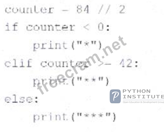 The code snippet that you have sent is a conditional statement that checks if a variable "counter" is less than 0, greater than or equal to 42, or neither. The code is as follows: if counter < 0: print("") elif counter >= 42: print("") else: print("") The code starts with checking if the value of "counter" is less than 0. If yes, it prints a single asterisk () to the screen and exits the statement. If no, it checks if the value of "counter" is greater than or equal to 42. If yes, it prints three asterisks () to the screen and exits the statement. If no, it prints two asterisks () to the screen and exits the statement. The expected output of the code depends on the value of "counter". If the value of "counter" is 10, as shown in the image, the code will print two asterisks (**) to the screen, because 10 is neither less than 0 nor greater than or equal to 42. Therefore, the correct answer is C. * * Reference: [Python Institute - Entry-Level Python Programmer Certification]
