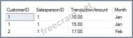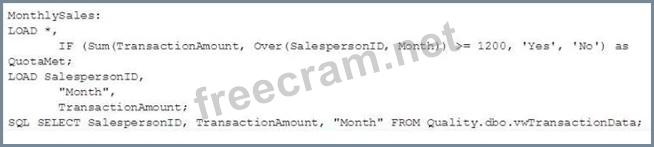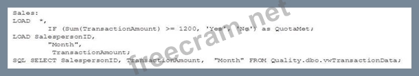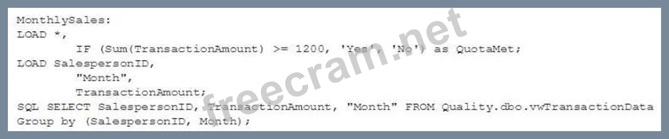 Refer to the exhibit. An organization stores sales data in SQL Server. A database administrator creates a view to show the transaction data. The data architect must: Create a data model that shows the total sales for each salesperson by month Create an indicator that shows whether the total monthly sales meet or exceed the monthly quota, which is always $1,200 Which script should the data architect use to meet these requirements? A: B: C: D: